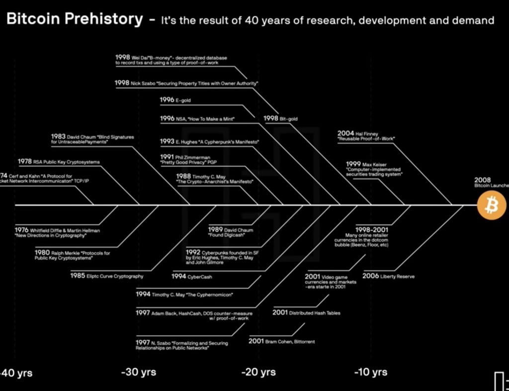 1) O Bitcoin não surgiu do nada. Antes disso, ele não seria possível, pois as tecnologias utilizadas simplesmente não existiam. Ele é, na verdade, uma conjunção de cerca de 40 anos de estudos e aplicações tecnológicas. Cada projeto que morreu ao longo do caminho deixou elementos que foram usados pelo seu fundador mais adiante.
