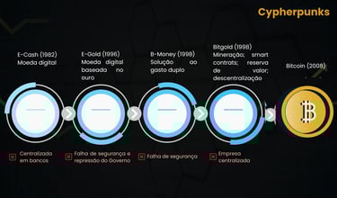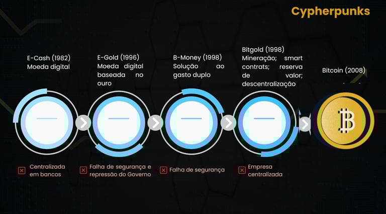 Em específico, destaca-se o trabalho de um grupo de programadores que ficou conhecido como “Cypherpunks”. Os Cypherpunks eram basicamente indivíduos que acreditavam que a criptografia seria uma ferramenta chave para proteger a privacidade e liberdade na era digital.