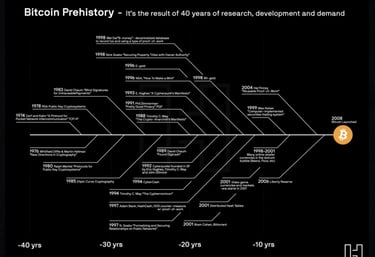 O Bitcoin é o resultado de vários experimentos tecnológicos predecessores. Com o avanço da computação e da internet foram desenvolvidos dezenas de projetos e conceitos que de forma mais direta ou indireta contribuíram para a gênese do Bitcoin.