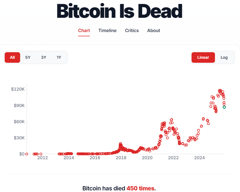 O site https://bitcoindeaths.com/ é um dos que curiosamente contabilizam a quantidade de vezes que foi decretada a morte do Bitcoin. Eles fazem isso catalogando os momentos mais críticos de queda e de ataques públicos que gurus financeiros do mercado tradicional fazem ao Bitcoin. A sua contagem atual mostra que isso já aconteceu 450 vezes. O momento atual deve entrar para essa apuração: